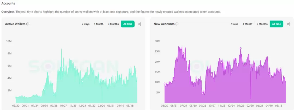- À direita: Total de novas contas criadas — indica quantos novos endereços participaram da rede a cada período, evidenciando fases de crescimento, interesse e entrada de novos usuários no ecossistema.