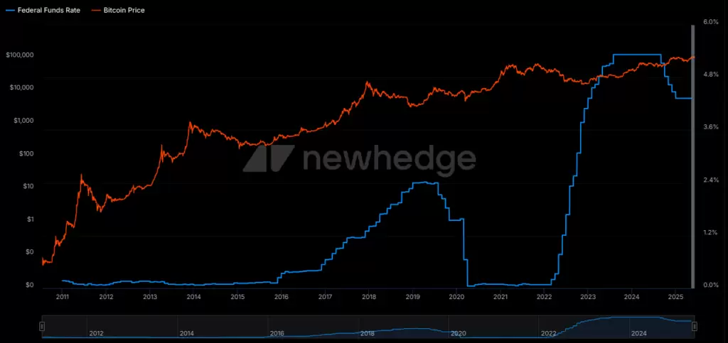 A relação entre o preço do Bitcoin e a Taxa de Juros Federal dos EUA (2011-2025):